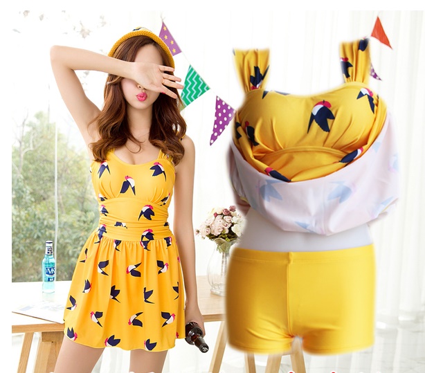 ชุดว่ายน้ำแฟชั่นพร้อมส่ง :ชุดว่ายน้ำสีน้ำเงินแต่งลายนกสีสันสดใสแบบเก๋ กางเกงขาสั้นใส่ด้านในน่ารักมากๆจ้า
