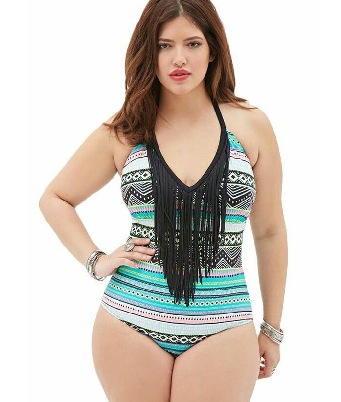 ชุดว่ายน้ำวันพีชพร้อมส่ง :ชุดว่ายน้ำคนอ้วน วันพีชสีดำลายกราฟฟิกแต่งพู่และสายคล้องคอผูกโบว์ สีสันสดใสแบบเก๋ Sexy มากๆจ้า