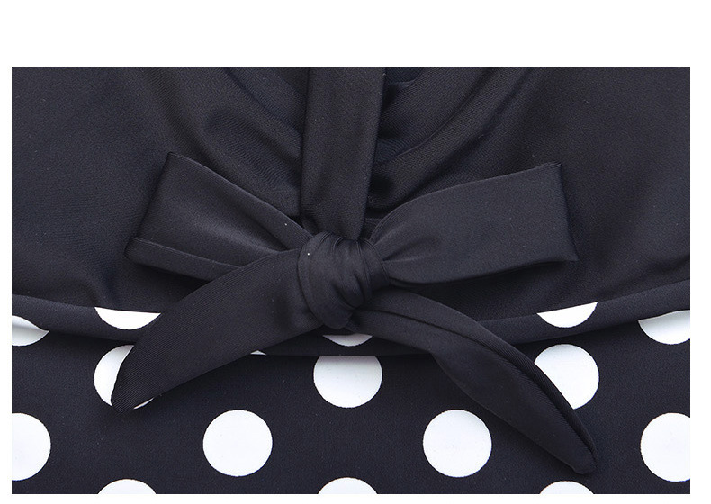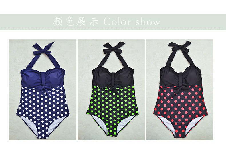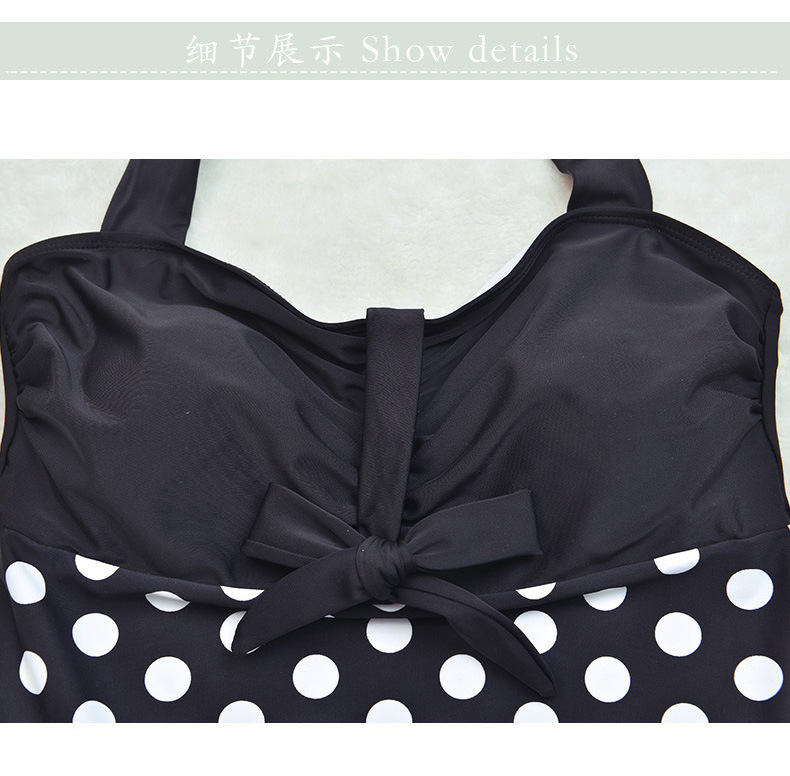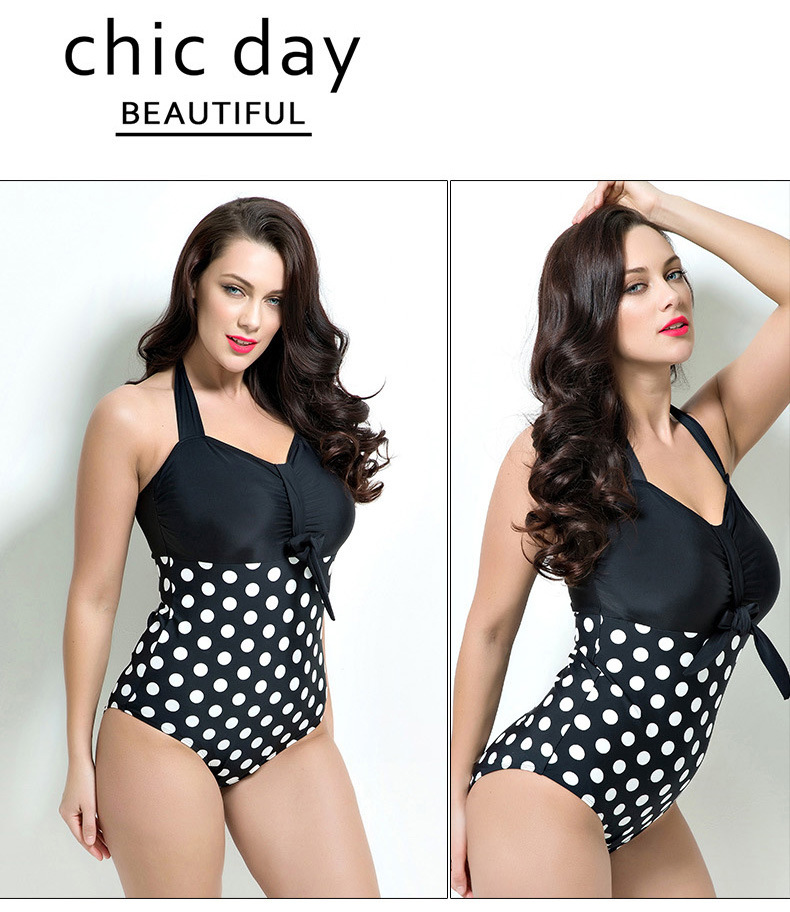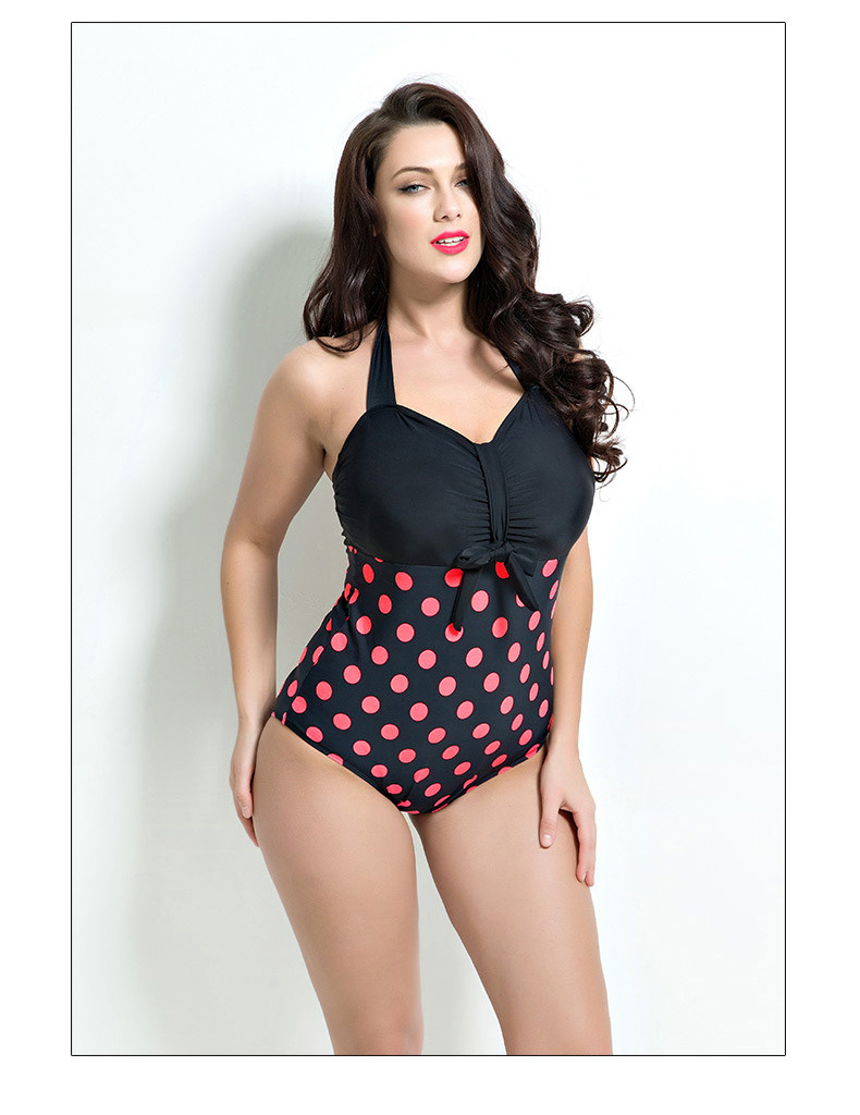 ชุดว่ายน้ำคนอ้วน ไซส์ใหญ่พร้อมส่ง :ชุดว่ายน้ำวันพีชแฟชั่นสีดำแต่งลายจุดสีชมพู สายคล้องคอผูกโบว์แบบเก๋ sexyมากๆจ้า