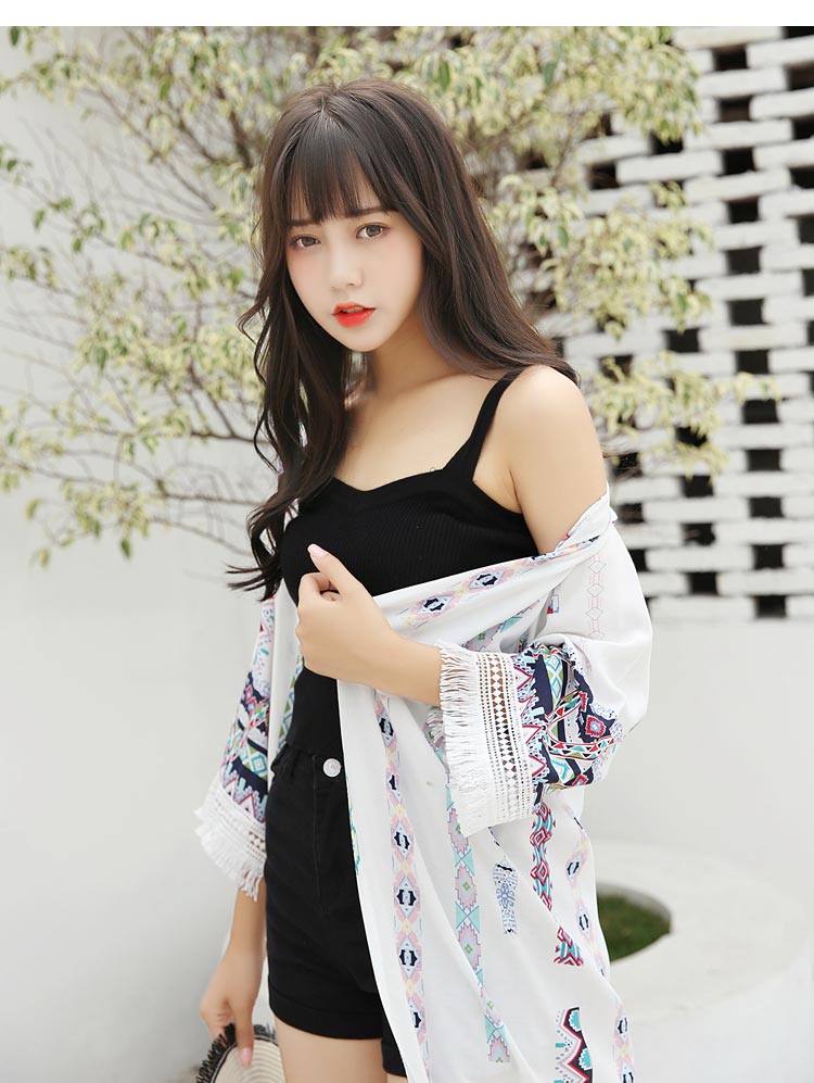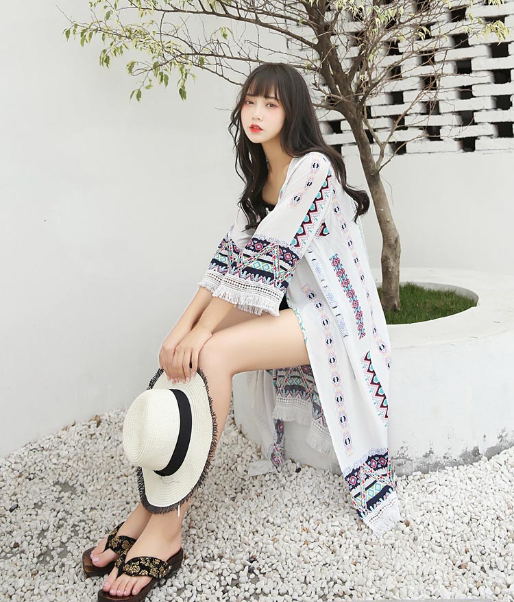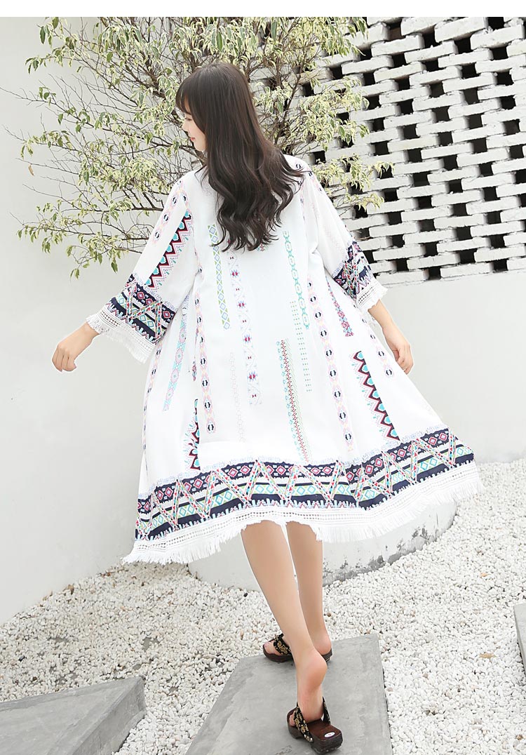 เสื้อคลุมแฟชั่น พร้อมส่ง : เสื้อคลุมสีขาวลายโบฮีเมียนแต่งพู่ที่ขอบแขน แบบสวยมากจ้า