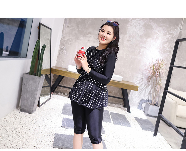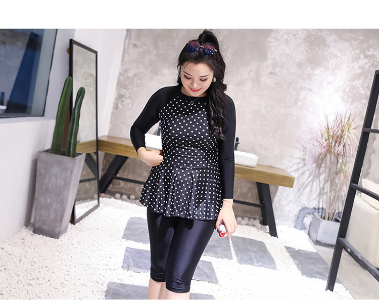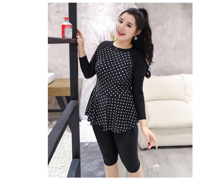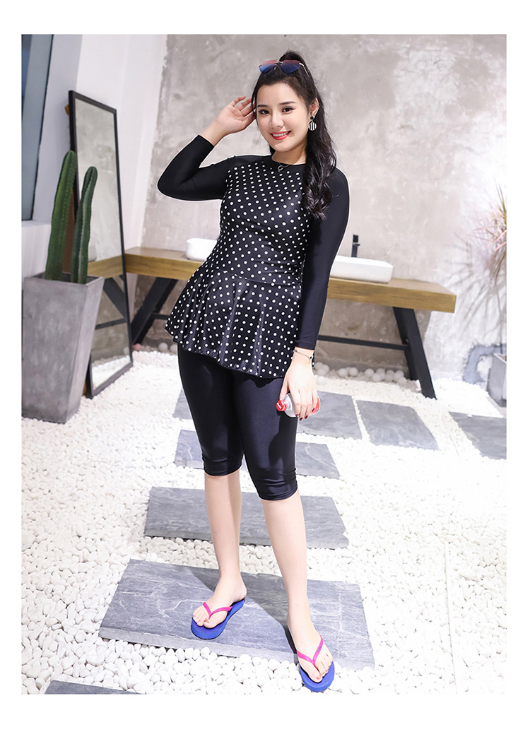 ชุดว่ายน้ำคนอ้วน ทูพีชพร้อมส่ง :ชุดว่ายน้ำไซส์ใหญ่แขนยาวสีดำแต่งลายจุดสีขาวและระบาย แบบสวยน่ารักมากๆจ้า