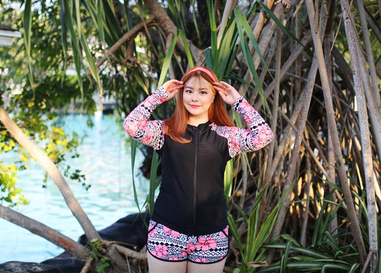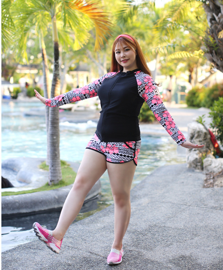 ชุดว่ายน้ำคนอ้วน แบบสปอร์ตพร้อมส่ง :ชุดว่ายน้ำไซส์ใหญ่สีดำแขนยาวซิปหน้าแต่งลายดอกไม้สีชมพู set 3 ชิ้น มีเสื้อแขนยาว บรา และกางเกงขาสั้น แบบสวยน่ารักมากๆจ้า