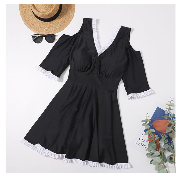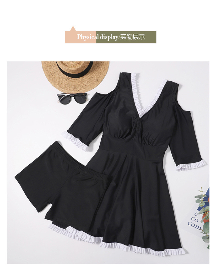 ชุดว่ายน้ำคนอ้วน ชุดเที่ยวทะเล 4xl พร้อมส่ง:ชุดว่ายน้ำไซส์ใหญ่สีดำแต่งระบาย เว้าไหล่ มาพร้อมกางเกงขาสั้น แบบสวยมากๆจ้า