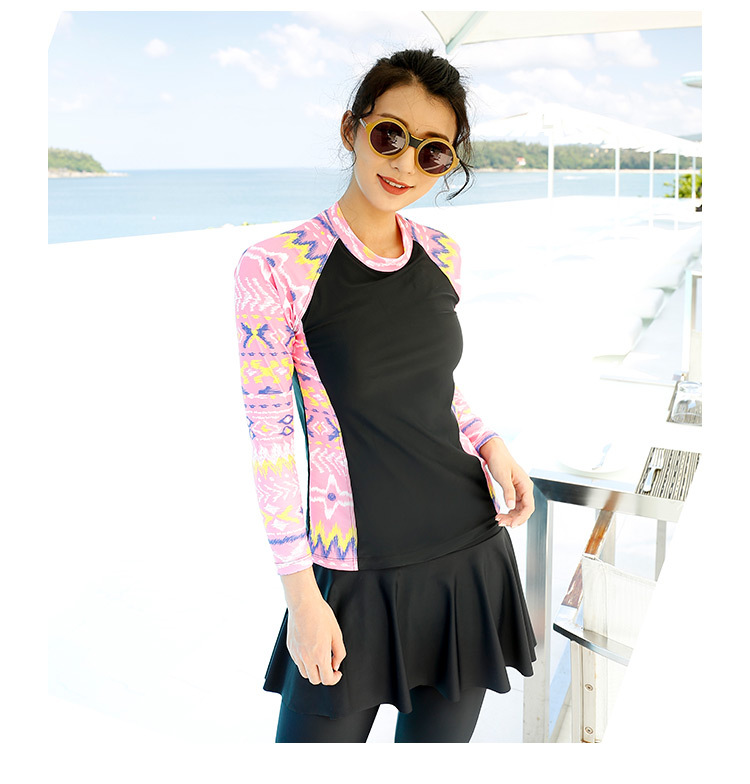 ชุดว่ายน้ำคนอ้วน 6xl ไซส์ใหญ่แบบสปอร์ตพร้อมส่ง : ชุดว่ายน้ำสีดำแขนขายาวแต่งลายกราฟิกสีชมพู กางเกงขายาวแต่งกระโปรงระบาย แบบสวยมากๆจ้า